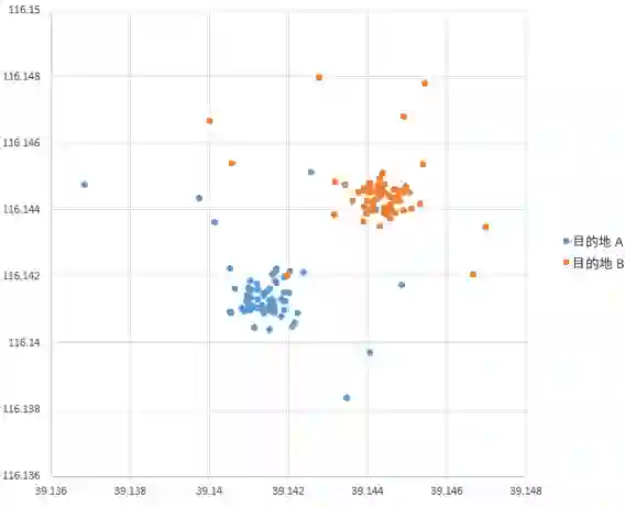 下边是他去目的地 A 和目的地 B 对应的出发地经纬度分布,横轴是纬度,纵轴是经度。蓝点是这个用户去目的地 A 的经纬度,集中在一个区域;红点是这个用户去目的地 B 的经纬度,集中在另外一个区域。我们发现我们用他的出发地经纬度可以很好的区分他是去 A 目的地还是 B 目的地。