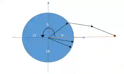 下图是一个圆的表盘,有两个坐标轴,x 轴和 y 轴。每一个时刻用向量表示,然后求和向量。刚才问题里的 3 点、22 点、23 点三个点的和向量是 0,所以均值是 0。