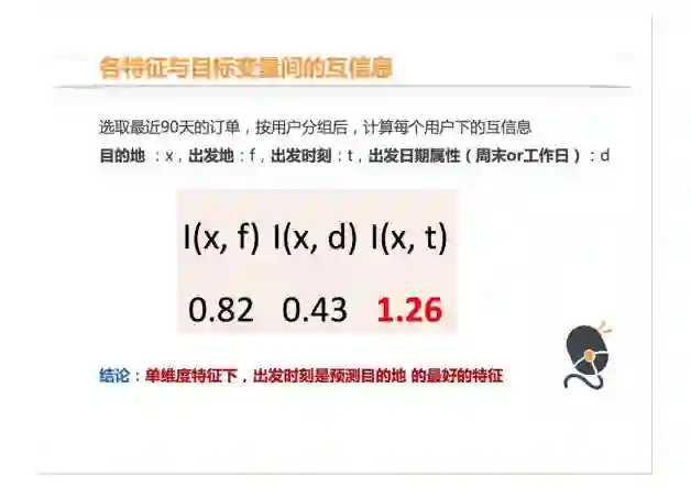这个时候,面对这么多特征,我们需要做的首先是选择一个主要特征。特征选择的原则,是选择和被预测变量最相关的特征。通常,度量变量之间的相关性的指标是皮尔逊系数和互信息。皮尔逊系数通常用来衡量两个连续型随机变量的相关性,计算出来的结果是线性相关性。刚才我们说到我们的备选特征既有连续型,也有离散型,还有周期型和复合型的,所以在这我们选择了互信息来衡量变量之间的相关性。因为我们的目标是目的地,待选特征先圈定了出发地、出发时刻、出发时期这三个变量。