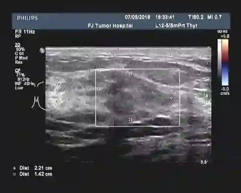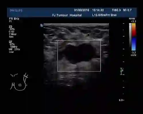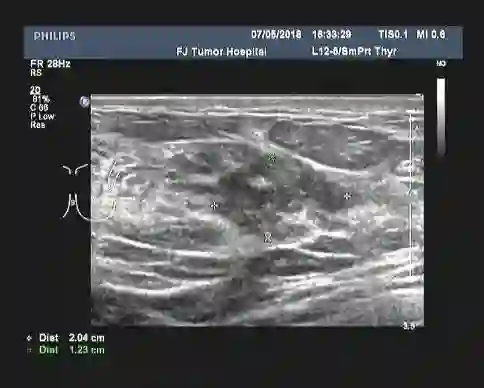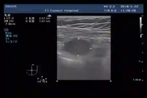 ▎疗效评估:B超(2018-07):左乳2-3点处探及一低回声区,大小约2.2cm×1.4cm,边缘不规则,可见成角、毛刺,内部回声不均;左腋中、下组探及数个低回声,大者约1.6cm×0.7cm(腋中组)、0.9cm×0.5cm(腋下组),边界尚清,类圆形,皮髓质分界不清,皮质不规则增厚,淋巴结门消失,右乳及右腋窝未见异常。