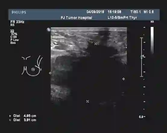 ▎疗效评估: B超(2018-04):左乳外上象限探及一低回声区,大小约4.9cm×3.9cm,边缘不规则,可见成角、毛刺,内部回声不均;左腋中下组探及数个低回声,大者约2.5cm×1.6cm,边界尚清,类圆形,皮髓质分界不清,皮质不规则增厚,淋巴结门消失;右乳及右腋窝未见异常。
