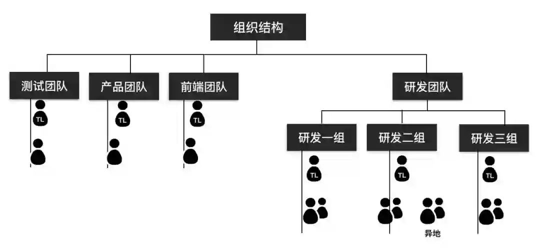 可以看到,产品、前端 、后台、测试属于不同的职能部门。这是一个非常普遍的组织形式——职能型组织。