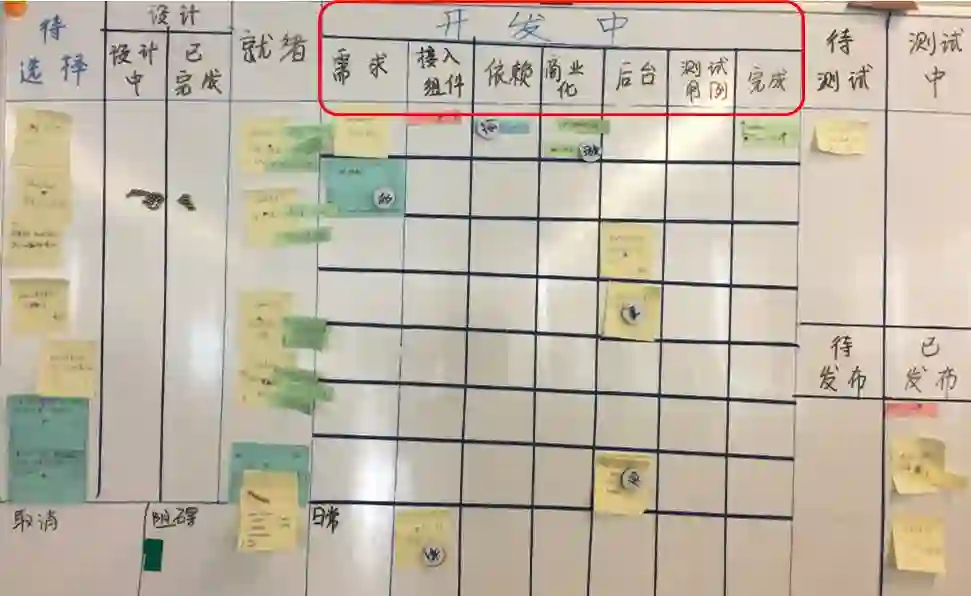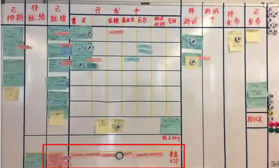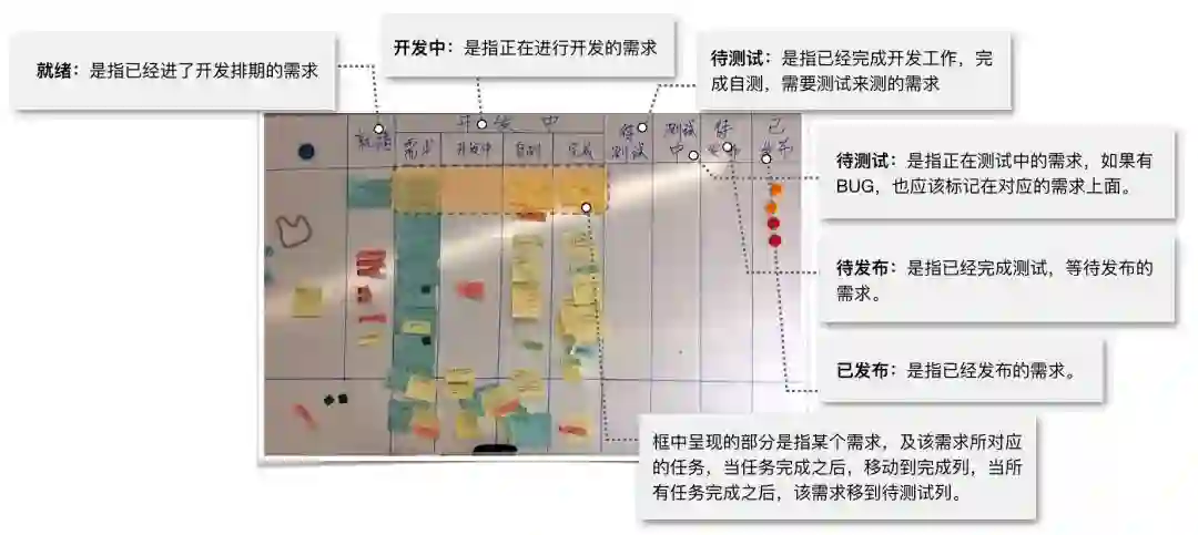初期的可视化板,主要是展现出团队当前迭代要做的工作以及每天出现的问题。过程中对物理板的规则并未做太多约束,主要起到可视化的作用。这样一方面降低了可视化工作的门槛,让大家愿意使用,另一方面,能把大家最真实的工作状况给反映出来,如下图所示: