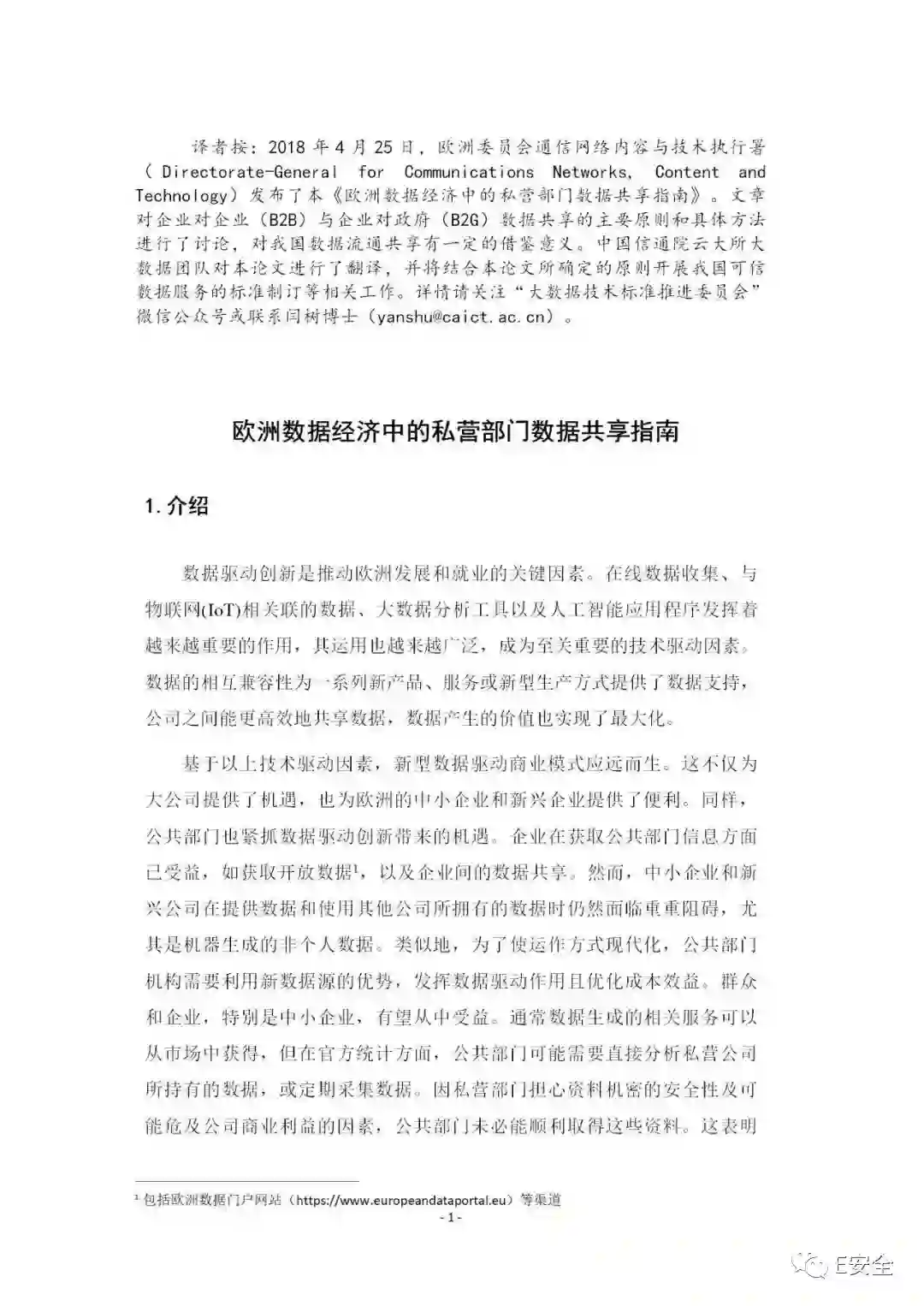 小编来报:2018年4月25日,欧洲委员会通信网络内容与技术执行署(Directorate-General for Communications Networks, Content and Technology)发布了《欧洲数据经济中的私营部门数据共享指南》(Guidance on sharing private sector data in the European data economy)。中国信通院云大所大数据团队对本论文进行了翻译。