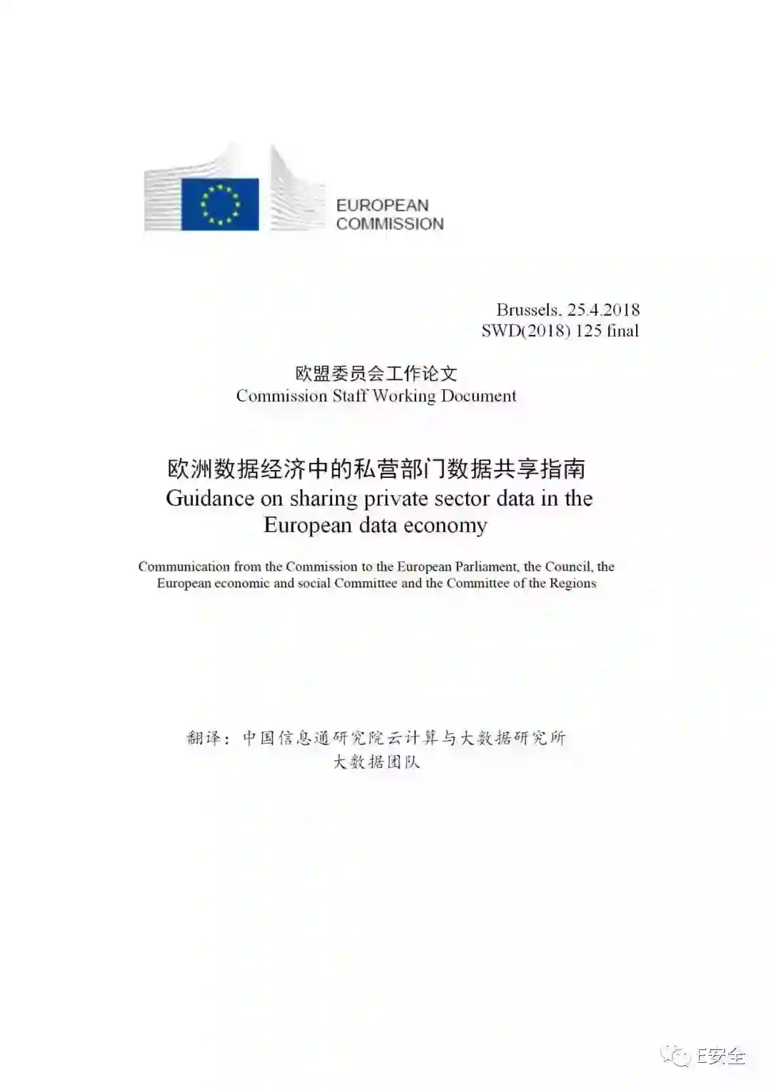2018年4月25日,欧洲委员会通信网络内容与技术执行署(Directorate-General for Communications Networks, Content and Technology)发布了《欧洲数据经济中的私营部门数据共享指南》(Guidance on sharing private sector data in the European data economy)。