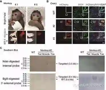 基于实验室之前的研究,同源臂介导的末端接合(HMEJ)的方法可以有效地在猕猴胚胎上实现高效的靶向基因整合。研究人员进一步优化受精卵注入条件,包括供体质粒浓度以及注射剂量,期望在提高敲入效率的同时保持正常的胚胎发育,进而获得基因敲入的猴子。具体来说,研究人员在Actb (β-actin) 位点插入p2A-mCherry以实现mCherry在Actb启动子的控制下表达。在经历完整的怀孕周期后,研究人员成功地获得了一对双胞胎猴(#1,雄;#2,雌)和三只单胎的雌性猴 (#3、#4和#5)。通过直接表皮荧光观察两只新生猴(#1,#5)的脚趾发现,与野生型相比,#1和#5展现出mCherry荧光。对两只死亡雌猴子(#2,#3)的各个组织进行切片观察,发现尾巴、脚趾、心脏、肌肉、心脏、肾、大脑和卵巢均显示出不同嵌合程度的mCherry表达。值得注意的是,研究人员在卵巢的大部分区域都检测到mCherry的表达,说明基因敲入猴子具有生殖系传递的可能性。所有组织的PCR鉴定测序结果都表明在5’和3’连接处的整合是正确的。此外,Southern印迹分析进一步证实# 2和# 3猴的基因整合是正确的且没有额外的基因随机整合。