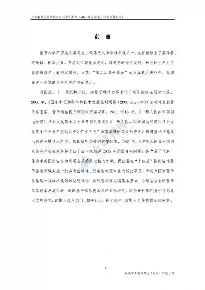 为推动全国上下更好地认识、理解量子信息、了解国家战略导向,提高社会各界对这一前沿科技领域的重视程度、投入强度、支持力度,进而助力国家战略部署有效落实,5月12日,众诚智库重磅发布“国家战略科技研究系列之《2021年全球量子信息发展报告》”。