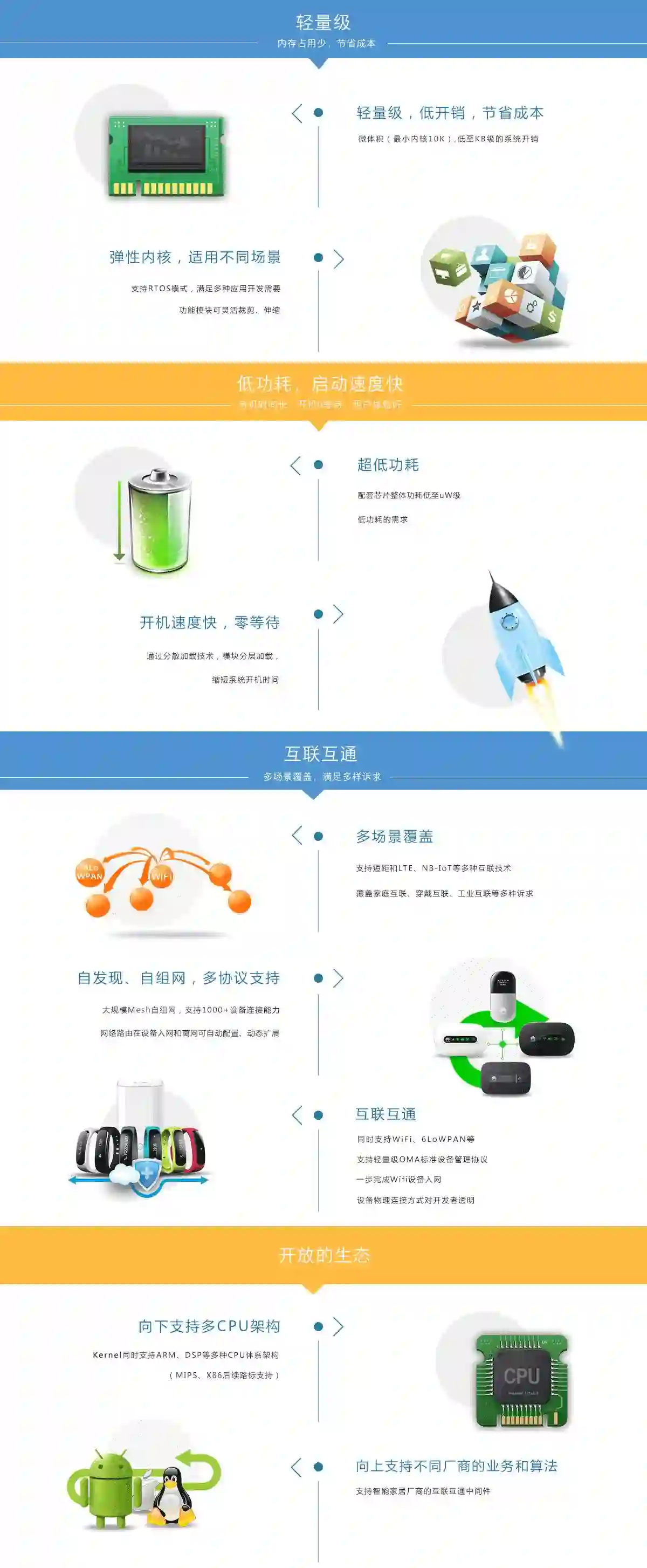 Huawei LiteOS 是华为面向IoT领域,构建的"统一物联网操作系统和中间件软件平台",以轻量级(内核小于10k)、低功耗(1节5号电池最多可以工作5年),快速启动,互联互通,安全等关键能力,为开发者提供 "一站式" 完整软件平台,有效降低开发门槛、缩短开发周期。