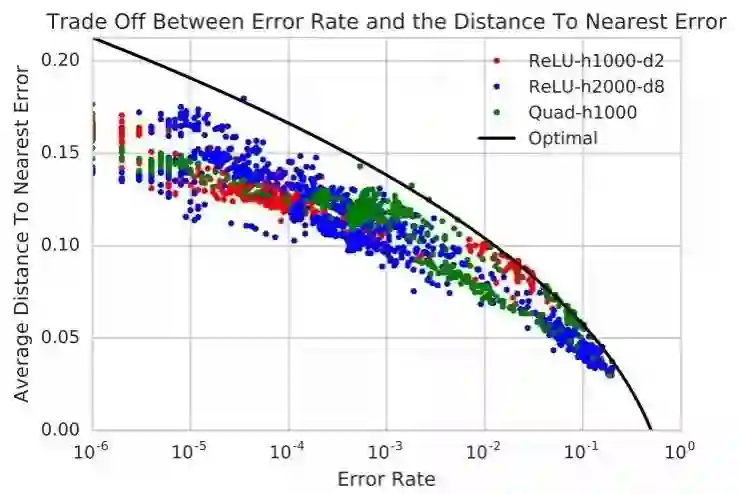 作者们经过研究得到了这样的结论:「测试集上出现分类错误的点出现的概率」和「到最近的分类错误点之间的距离」,两者之间的关系是与模型无关的。任何一个总会分类错误球面上的一小部分点的模型,就一定会在多数随机采样的数据点附近存在会被分类错误的点,不管模型分类错误的点在球面上的分布如何。在球面数据集上训练的神经网络都会自然地逼近作者们找到的这个测试误差和平均距离之间的理论最优平衡曲线。这似乎表明,为了按线性减小到最近的分类错误点之间的平均距离,模型的分类错误率需要以指数减小。