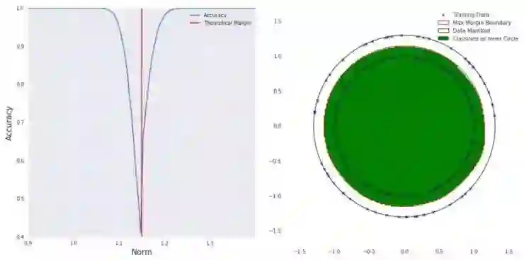 为了能够验证这种假说,作者们构建了两个同心的高维球面数据集,训练网络做这个二分类任务,以此开展研究。两个球面分别为 r=1 和 R=1.3,数据维度最高为 5000,并且数据点就分布在球面上(AI 科技评论注:这也就是标题中的「spheres」的含义)。在这样的设定中,数据流形有数学上的完善定义,而且模型学到的决策边界也是可以有解析性的表示的;而以往的基于现有图像数据集的研究中,数据流形是不可知的,决策边界也无法表示,就很难进行研究。更重要的是,通过自己生成数据的过程,作者们可以自由地变化数据维度的数目大小,从而研究输入维度数目对神经网络的泛化误差存在性的影响。