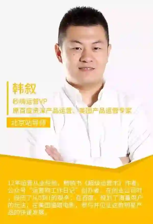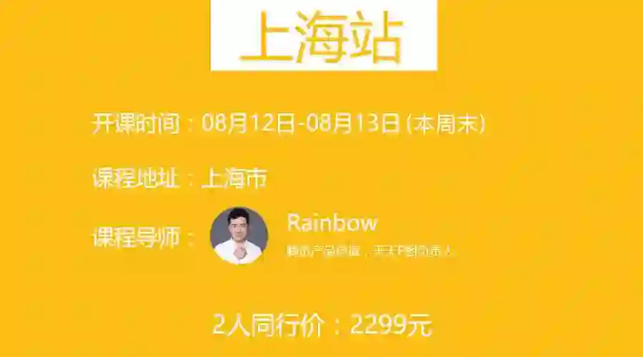 本周末(8月12日)上海站,最后几天,起点学院邀请天天P图负责人,腾讯产品总监,腾讯学院认证讲师Rainbow老师,采用案例式教学+实战模拟的授课模式,系统讲解互联网运营思维、用户运营、活动运营、渠道运营、数据运营的种种。让老司机帮你构建系统的知识体系,玩转运营套路,让工作更加得心应手!