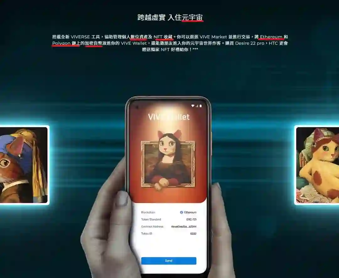 它不仅配置虽然难看了一点,而且想得也美啊。在官方宣传页面上,HTC Desire 22 pro 直接 buff 叠满,元宇宙、NFT、加密货币、区块链,行业风口上的热词一网打尽。
