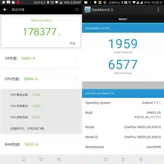 跑分方面一加5T没有令我失望,「双8」旗舰不是随便说说的。安兔兔跑分178377分,其中RAM性能高达10335分。GeekBench 3单核得分1959多核6577。这个性能处在Android第一梯队,仅次于A11苹果机型。