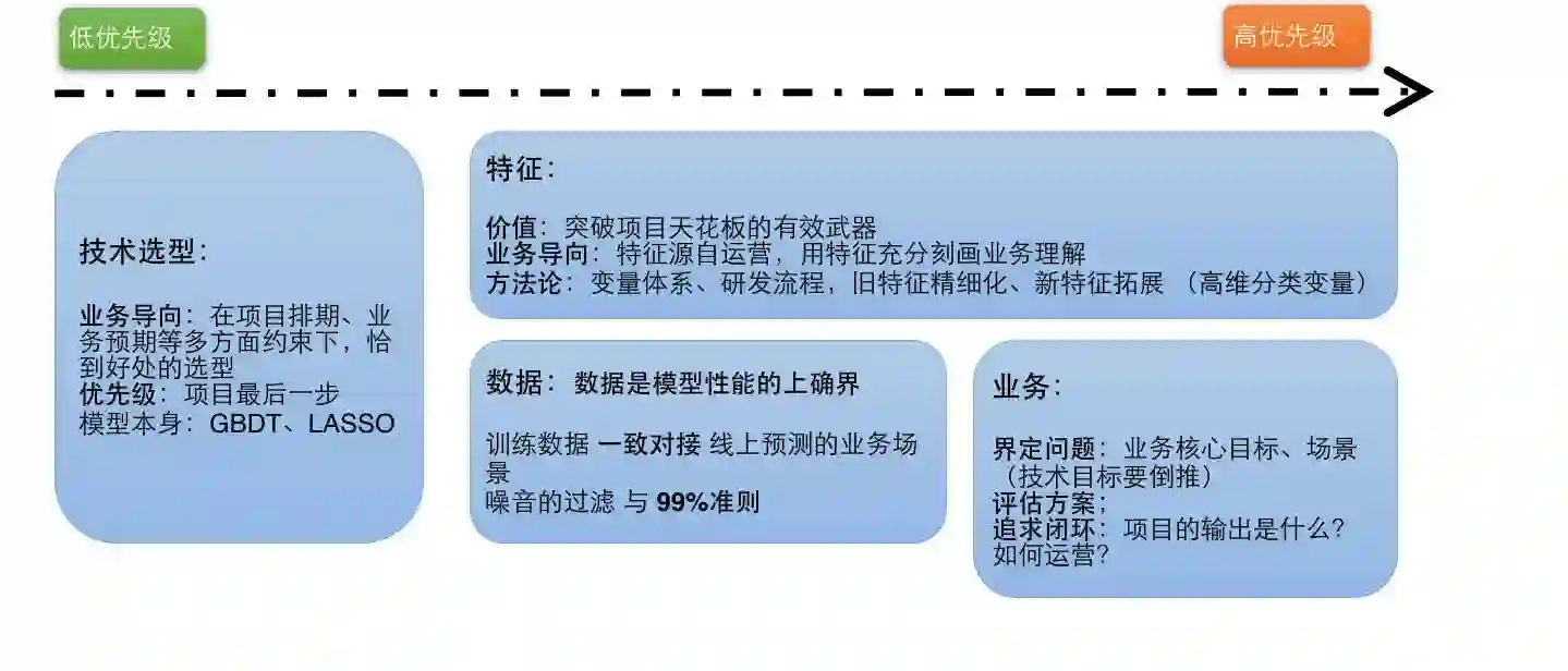 项目推进过程中,四个要素相互之间的优先级大致是:业务>特征>数据>模型。