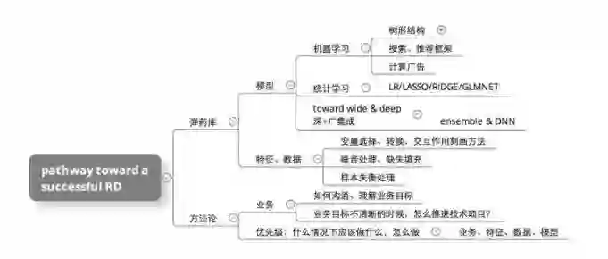 图1列出了我认为一个成功的机器学习工程师需要关注和积累的点。机器学习实践中,我们平时都在积累自己的“弹药库”:分类、回归、无监督模型、Kaggle上面特征变换的黑魔法、样本失衡的处理方法、缺失值填充……这些大概可以归类成模型和特征两个点。我们需要参考成熟的做法、论文,并自己实现,此外还需要多反思自己方法上是否还可以改进。如果模型和特征这两个点都已经做得很好了,你就拥有了一张绿卡,能跨过在数据相关行业发挥模型技术价值的准入门槛。