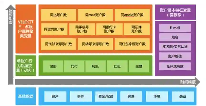 反作弊变量体系(维度甲:作弊环节,登录、注册、实名、转账、交易、参与营销活动、改密……维度乙:作弊介质,账户、设备、IP、WiFi、银行卡……)。