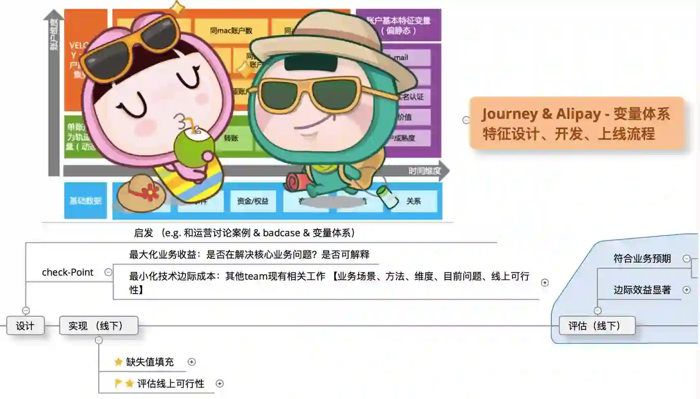 这两个方面的整合,就是一个变量的体系。变量(特征),从技术层面是加工数据,而从业务层面实际在反应RD的业务理解和数据刻画业务能力。“二维图”,实际上未必是二维的,更重要的是我们需要把业务整个流程抽象成几个核心的维度,举几个例子: