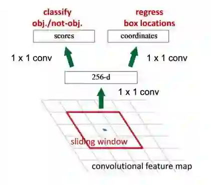 Faster R-CNNFast R-CNN存在的问题:存在瓶颈:选择性搜索,找出所有的候选框,这个也非常耗时。那我们能不能找出一个更加高效的方法来求出这些候选框呢? 解决:加入一个提取边缘的神经网络,也就说找到候选框的工作也交给神经网络来做了。 所以,rgbd在Fast R-CNN中引入Region Proposal Network(RPN)替代selective search,同时引入anchor box应对目标形状的变化问题。 具体做法: • 将RPN放在最后一个卷积层的后面 • RPN直接训练得到候选区域RPN简介: • 在feature map上滑动窗口 • 建一个神经网络用于物体分类+框位置的回归 • 滑动窗口的位置提供了物体的大体位置信息 • 框的回归提供了框更精确的位置