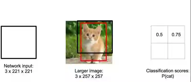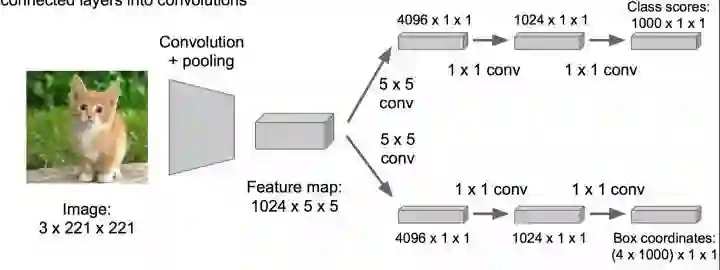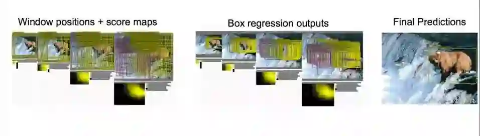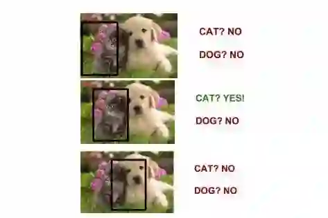 根据得分的高低,我们选择了右下角的黑框作为目标位置的预测。 注:有的时候也会选择得分最高的两个框,然后取两框的交集作为最终的位置预测。 疑惑:框要取多大? 取不同的框,依次从左上角扫到右下角。非常粗暴啊。 总结一下思路: 对一张图片,用各种大小的框(遍历整张图片)将图片截取出来,输入到CNN,然后CNN会输出这个框的得分(classification)以及这个框图片对应的x,y,h,w(regression)。