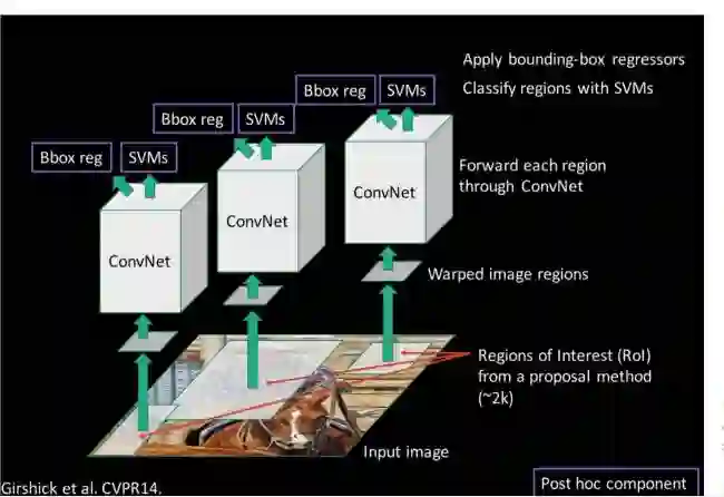 有了候选区域,剩下的工作实际就是对候选区域进行图像分类的工作(特征提取+分类)。对于图像分类,不得不提的是2012年ImageNet大规模视觉识别挑战赛(ILSVRC)上,机器学习泰斗Geoffrey Hinton教授带领学生Krizhevsky使用卷积神经网络将ILSVRC分类任务的Top-5 error降低到了15.3%,而使用传统方法的第二名top-5 error高达 26.2%。此后,卷积神经网络CNN占据了图像分类任务的绝对统治地位。 2014年,RBG(Ross B. Girshick)使用region proposal + CNN代替传统目标检测使用的滑动窗口+手工设计特征,设计了R-CNN框架,使得目标检测取得巨大突破,并开启了基于深度学习目标检测的热潮。