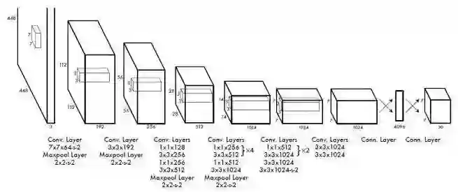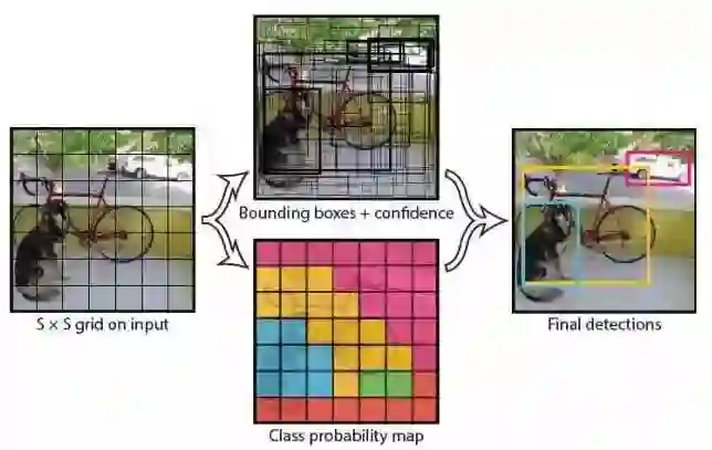 我们直接看上面YOLO的目标检测的流程图: (1) 给个一个输入图像,首先将图像划分成7*7的网格 (2) 对于每个网格,我们都预测2个边框(包括每个边框是目标的置信度以及每个边框区域在多个类别上的概率) (3) 根据上一步可以预测出7*7*2个目标窗口,然后根据阈值去除可能性比较低的目标窗口,最后NMS去除冗余窗口即可。 可以看到整个过程非常简单,不需要中间的region proposal在找目标,直接回归便完成了位置和类别的判定。