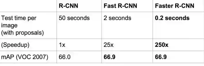 所以,Fast-RCNN很重要的一个贡献是成功的让人们看到了Region Proposal + CNN这一框架实时检测的希望,原来多类检测真的可以在保证准确率的同时提升处理速度,也为后来的Faster R-CNN做下了铺垫。画一画重点:R-CNN有一些相当大的缺点(把这些缺点都改掉了,就成了Fast R-CNN)。 大缺点:由于每一个候选框都要独自经过CNN,这使得花费的时间非常多。 解决:共享卷积层,现在不是每一个候选框都当做输入进入CNN了,而是输入一张完整的图片,在第五个卷积层再得到每个候选框的特征 原来的方法:许多候选框(比如两千个)-->CNN-->得到每个候选框的特征-->分类+回归 现在的方法:一张完整图片-->CNN-->得到每张候选框的特征-->分类+回归 所以容易看见,Fast R-CNN相对于R-CNN的提速原因就在于:不过不像R-CNN把每个候选区域给深度网络提特征,而是整张图提一次特征,再把候选框映射到conv5上,而SPP只需要计算一次特征,剩下的只需要在conv5层上操作就可以了。 在性能上提升也是相当明显的: