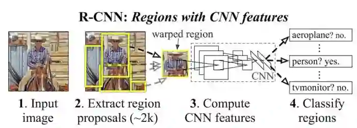 R-CNN的简要步骤如下(1) 输入测试图像 (2) 利用选择性搜索selective search算法在图像中从下到上提取2000个左右的可能包含物体的候选区域Region Proposal (3) 因为取出的区域大小各自不同,所以需要将每个Region Proposal缩放(warp)成统一的227x227的大小并输入到CNN,将CNN的fc7层的输出作为特征 (4) 将每个Region Proposal提取到的CNN特征输入到SVM进行分类 具体步骤则如下 步骤一:训练(或者下载)一个分类模型(比如AlexNet)步骤二:对该模型做fine-tuning • 将分类数从1000改为20 • 去掉最后一个全连接层