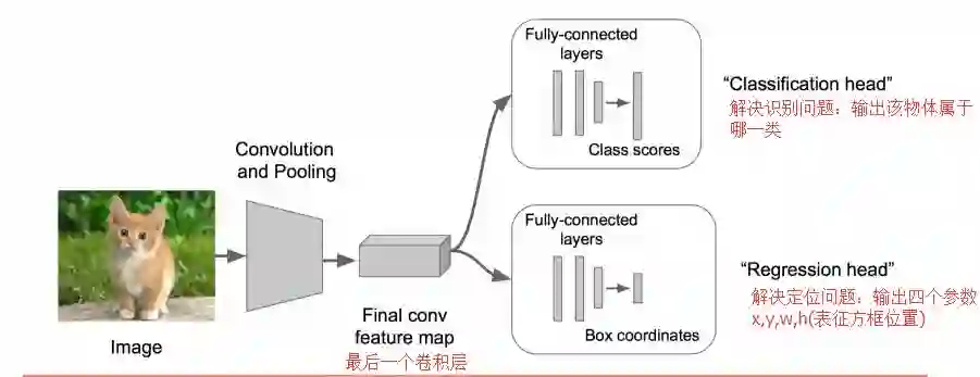 卷积神经网络CNN已经帮我们完成了图像识别(判定是猫还是狗)的任务了,我们只需要添加一些额外的功能来完成定位任务即可。 定位的问题的解决思路有哪些? 思路一:看做回归问题 看做回归问题,我们需要预测出(x,y,w,h)四个参数的值,从而得出方框的位置。