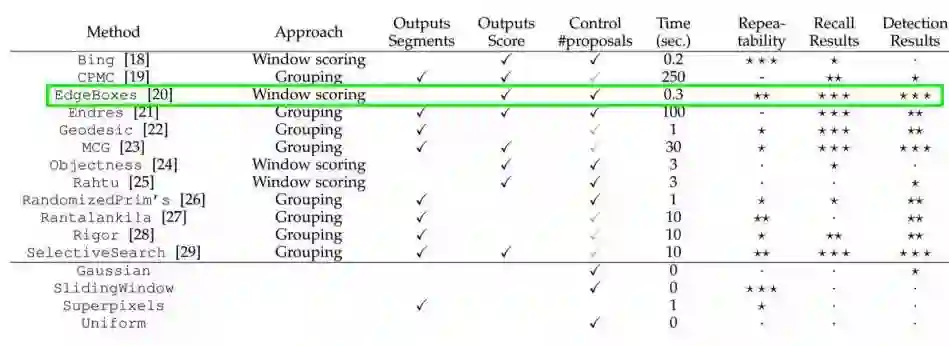 大牛们发明好多选定候选框Region Proposal的方法,比如Selective Search和EdgeBoxes。那提取候选框用到的算法“选择性搜索”到底怎么选出这些候选框的呢?具体可以看一下PAMI2015的“What makes for effective detection proposals?” 以下是各种选定候选框的方法的性能对比。