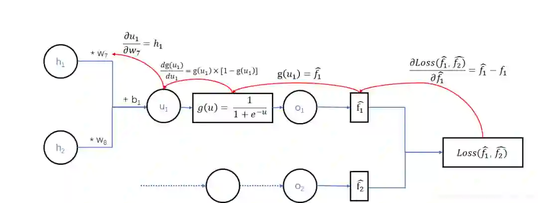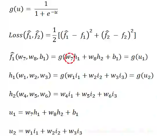 这里给 加上帽子,表示这两个函数(即目标函数)的函数值是预测值,区别于训练数据给出的实际标签值。而 均是目标函数的待定参数,这里我们假定神经元 均采用sigmoid激活函数,即 ,而神经元 不采用激活函数。