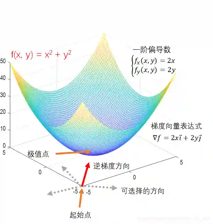 #在我们的例子里,梯度的计算式为2xi + 2yj。i和j分别是指向x轴正向和y轴正向的单位向量