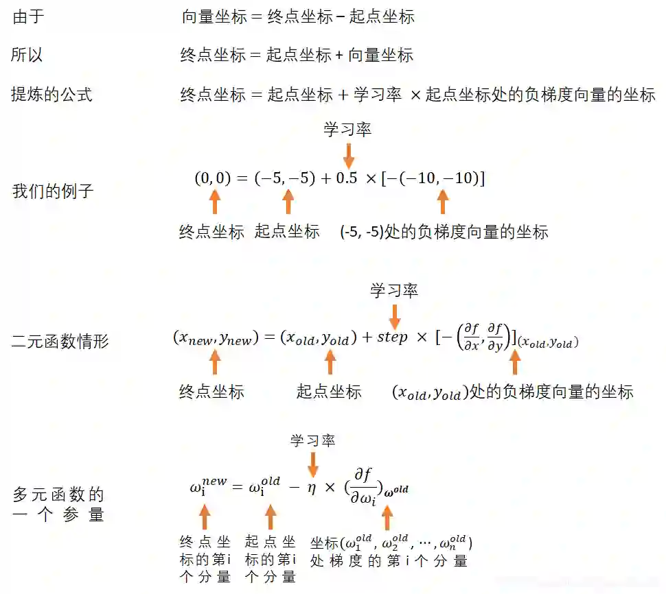 我们随机指定一个起点坐标(一组自变量取值),然后沿着梯度的方向求出未知的终点坐标,梯度是一个向量,本身也具有坐标