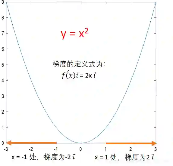 #在我们的例子里,梯度的计算式为2xi。i是指向x轴正向的单位向量
