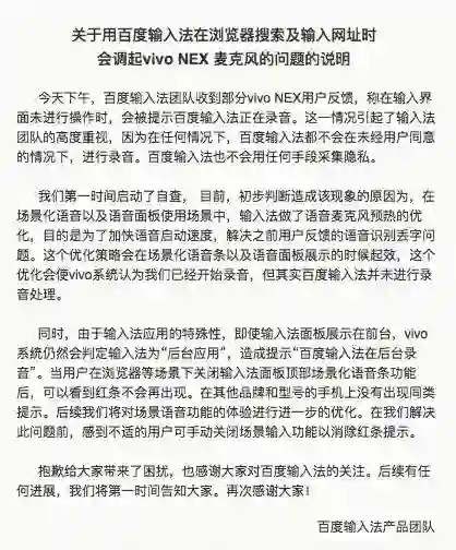 近日,有微博用户爆料,用户在vivo NEX上使用百度输入法在打开手机自带的浏览器进行搜索的时候,在无任何操作的情况下,手机顶部显示“百度输入法正在录音”,并且会提示用户是否要禁止它。百度输入法官方微博回应称,只需要关闭智能场景语音功能后就可以消除该问题。