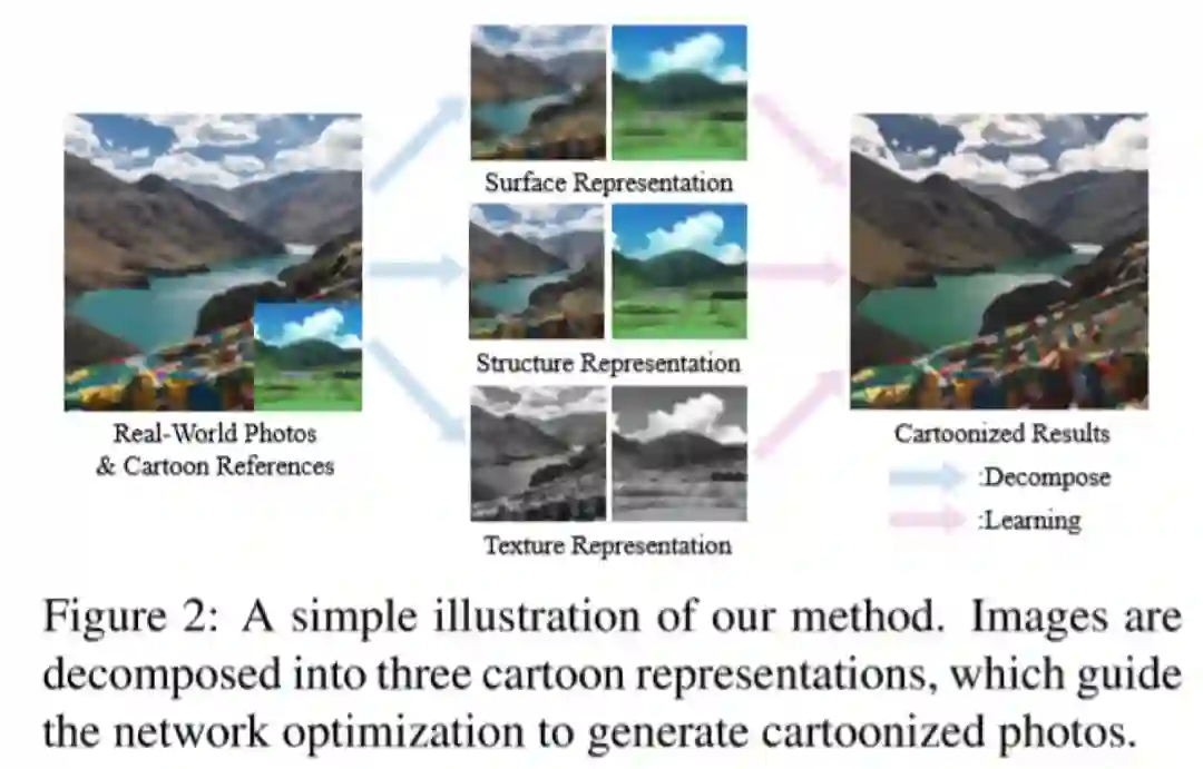 本文提出了一种将图像卡通化的方法。通过观察卡通绘画行为并咨询卡通艺术家,本文提出可以从图像中分别识别三个白盒表示:一是卡通图像平滑表面的轮廓表示,二是针对稀疏色块和全局内容的结构表示,三是在卡通图像中反映高频纹理,轮廓和细节的纹理表示。作者利用生成对抗网络(GAN)框架来学习提取的表示并将图像卡通化。