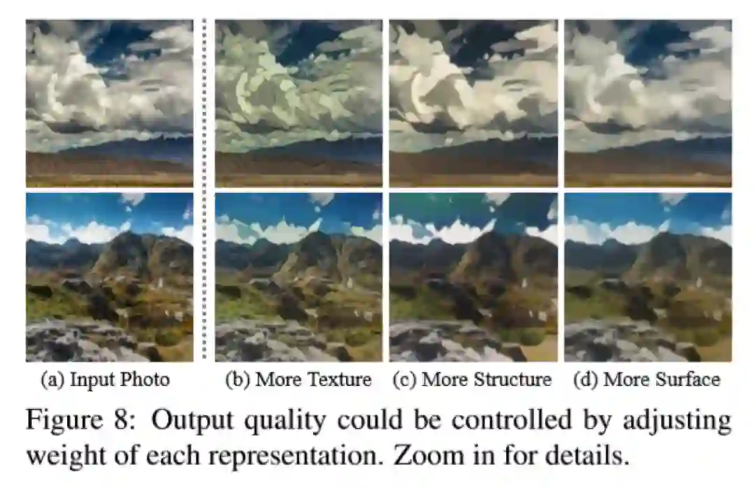 图10是显示消融实验中,每个特征表示的结果。图8展示了本文算法的可调控性。结果显示可以通过在损失函数中调整每个特征表征的权重来调整卡通化结果的样式。