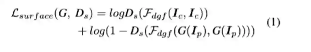 作者定义了一个网络F_dgf,以图片I为输入,并以它自己为guide map,输出提取的去掉纹理和细节的外观特征F(I,I)。同时定义了一个判别器D_s,用以判断真实图和卡通图的输出分布是否一致。损失函数就是经典的gan的损失函数,如下,其中Ic为输入的卡通图,Ip为真实图。