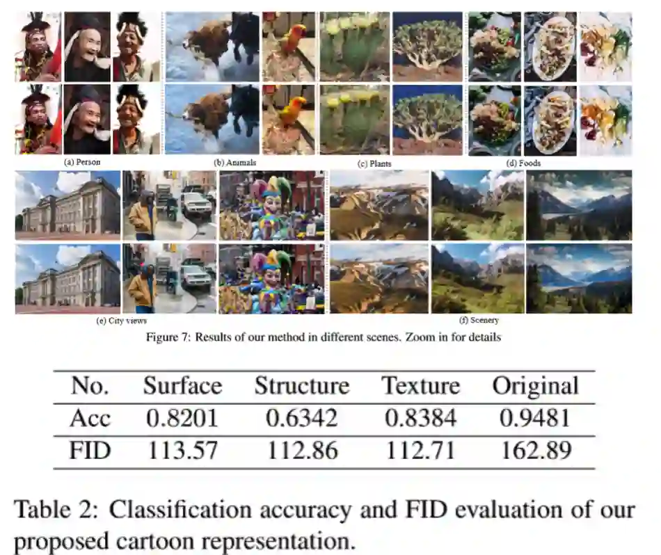 接下来作者做了消融实验,以FID为评价标准,结果如表格2所示。计算出的FID度量标准表明,卡通表征是有助于缩小现实世界的图像和卡通图像之间的距离,因为与原始图像相比,所有三个提取的卡通表征都具有较小的FID。