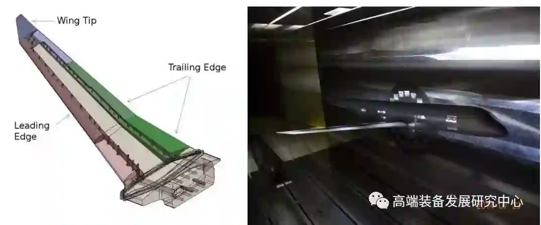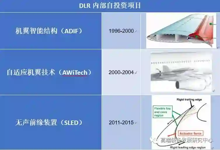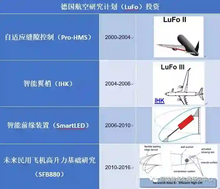 欧盟进行变形机翼研究的主要机构是德国航空航天中心(DLR)的复合材料和自适应系统研究所,该所从1995年对变形机翼结构就开展了研究。此后,DLR通过内部自投资、德国航空研究计划(Luftfahrtforschungsprogramm,LuFo)、欧盟框架计划持续对变形机翼的结构进行研究,这一系列研究涵盖智能机翼后缘、智能小翼、智能前缘、智能前缘缝翼等相关应用场景。
