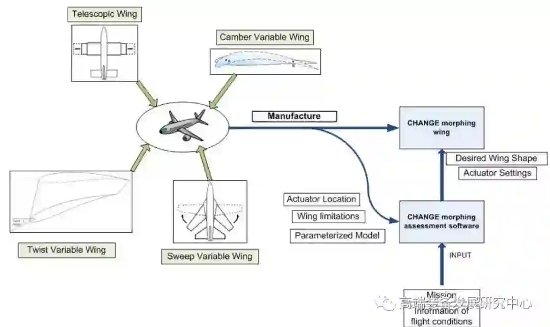 欧盟的CHANGE项目(联合变形软件使用飞行包络数据和基于任务的变形原型机翼开发)的研究目标是获得一种可以在起降高升力阶段增加弯度、高速飞行状态减小翼展、空中待命阶段增加翼展并减小弯度的技术。