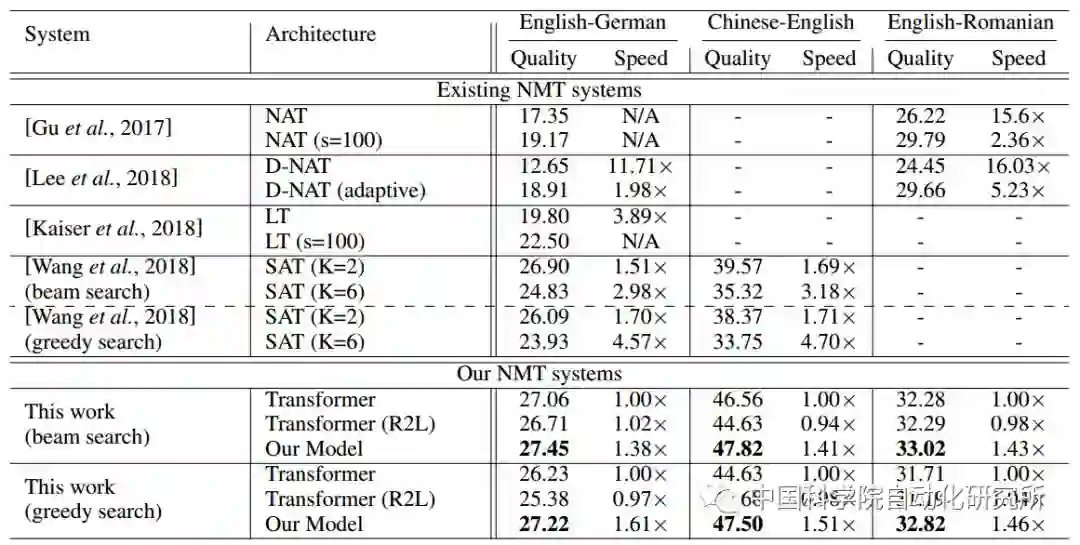 自动化所提出的同步双向序列生成模型(SBSG)采用了从目标序列的两端往中间的生成方式,每个时刻可以生成两个单词,相对于传统序列生成模型而言,理论上可以减少近一半的解码时间。其次,SBSG模型使用了一个交互双向注意力网络来实现从左到右解码(L2R)和从右到左解码(R2L)之间信息的相互利用,即一种解码模式可以利用另一种解码模式生成的序列来指导当前的解码。不同于生成质量出现显著下降的非自回归模型,SBSG模型相比于当前最优的自回归的Transformer模型在序列产生质量和解码速度上都得到了显著提升。