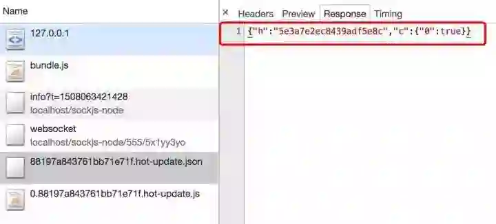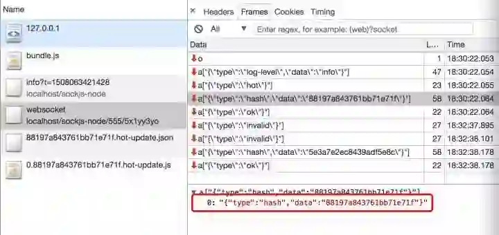 webpack-dev-server/client 当接收到 type 为 hash 消息后会将 hash 值暂存起来,当接收到 type 为 ok 的消息后对应用执行 reload 操作,如下图所示,hash 消息是在 ok 消息之前。