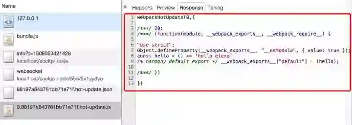 如上两图所示,值得注意的是,两次请求的都是使用上一次的 hash 值拼接的请求文件名,hotDownloadManifest 方法返回的是最新的 hash 值,hotDownloadUpdateChunk 方法返回的就是最新 hash 值对应的代码块。然后将新的代码块返回给 HMR runtime,进行模块热更新。