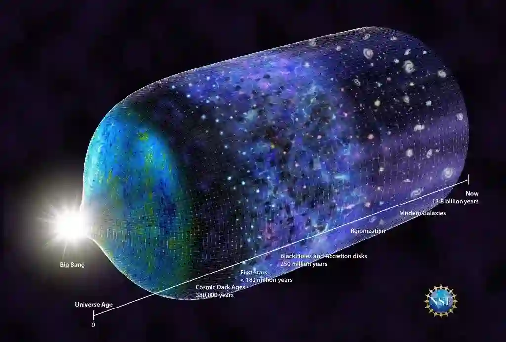 宇宙黑暗时代是在大爆炸结束(宇宙年龄38万年)到第一代恒星形成之前的时期,这一时期的宇宙中还没有恒星、星系等发光天体,甚至今天宇宙中的许多重元素如碳、氧、铁等也都还不存在,只有氢原子和氦原子弥漫在空间中。此后在万有引力的作用下,经过几千万年到几亿年的演化,才开始形成第一代恒星和星系,发出第一缕曙光,宇宙迎来了黎明。此后形成越来越多的恒星、星系和类星体,它们的辐射最终将宇宙气体电离(宇宙再电离),演化为今日的宇宙。关于宇宙的这一段演化,探测非常困难,我们目前还所知极少,《科学》杂志将此列为全世界最前沿的125个科学问题之一。