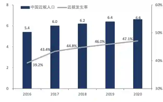 据国家卫健委数据,2020年我国总体近视发生率为47.1%,全国儿童青少年近视率为52.7%,较2019年上升了2.5个百分点,青少年近视率位于世界第一。