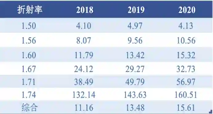 一般来说,镜片可以按折射率分为1.56、1.60、1.67、1.74等规格,折射率越高,镜片越薄,单价也更贵。目前,明月镜片已经实现了折射率为1.56、1.60系列树脂单体的自产,但是这类常规镜片属于“红海”市场,价格竞争激烈,利润空间很小。