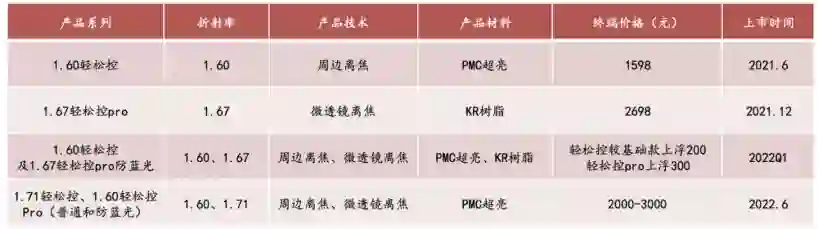 明月镜片轻松控主要产品矩阵