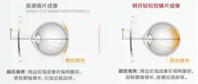 近几年,市面上出现一种青少年近视防控“神器”——离焦镜,与传统框架眼镜最大的不同在于离焦镜可以减缓青少年近视。离焦镜主要通过镜片度数的特殊设计,使周边区域成像于视网膜前,从而抑制眼轴增长,延缓近视加深。去年,明月镜片已经推出轻松控和轻松控Pro两大类离焦镜产品。
