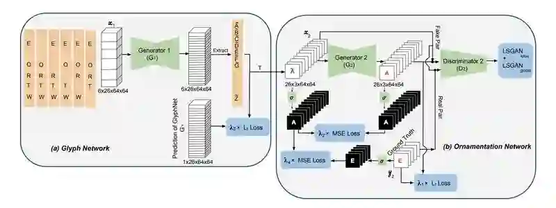 本文的模型建立在许多已有的工作基础之上。先从宏观角度来看,整个网络分为两个个阶段:第一阶段先根据不同字母之间的相互联系产生出基本的灰度字形,第二阶段给字母上色以及合成相应的装饰效果。