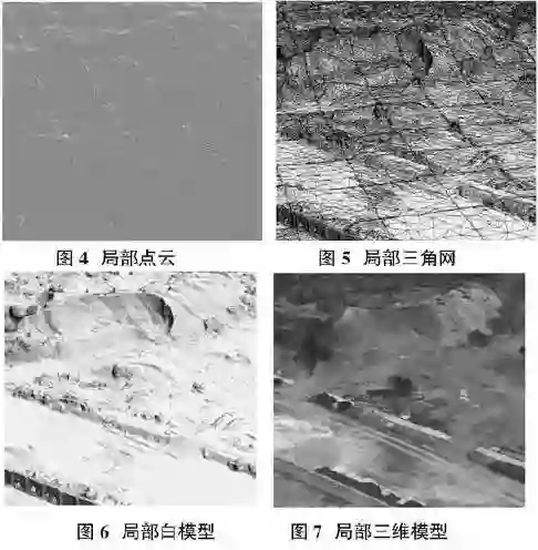 Smart3D Capure软件基于图形运算单元GPU的快速三维场景运算软件,可运算生成基于真实影像的高密度点云[13],如图4 所示,根据点云数据可以自动生成不规则三角网(TIN )数据如图5 所示,生成的白膜如图6 所示,自动对白膜三维模型赋予纹理,生成基于真实影像纹理的实景三维模型,如图7 所示。